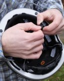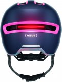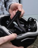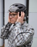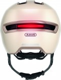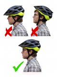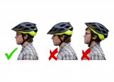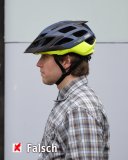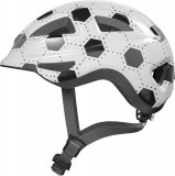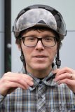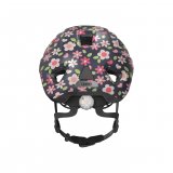 Ein Kind mit buntem Helm fährt mit einem Fahrrad über einen Platz.