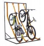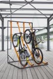 Ein Lastenrad mit einem Faltrad auf der Ladefläche, abgestellt am Rande einer großen Stellfläche für Fahrräder.