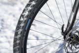 Ein orangefarbenes E-Bike mit Schnee in den Rädern und am Rahmen steht an eine Wand gelehnt.