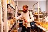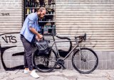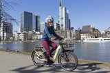 Ein Mann fährt auf einem E-Bike über eine Straßenkreuzung mit Straßenbahnschienen.