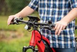 Rückansicht eines Fahrradhelmes auf dem Kopf einer Person.