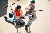 Ein Mädchen und ein kleinerer Junge fahren auf Fahrrädern. Das Mädchen lächelt dem Jungen zu und hat eine Hand auf seiner Schulter, um ihn zu unterstützen.