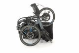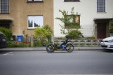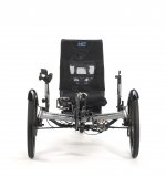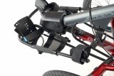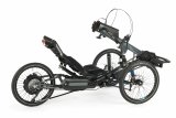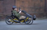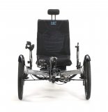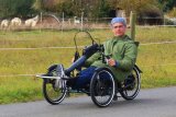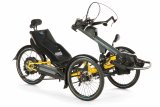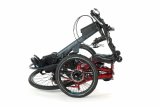 Ein Liegedreirad mit Handantrieb, einem großen Hinterrad und zwei kleineren Vorderrädern.
