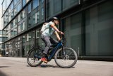 Eine Frau sitzt lächelnd hinter einem abgestellten E-Bike.