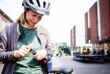 Eine Frau sitzt neben einem abgestellten E-Bike auf einer Bank und schaut lachend auf ein Smartphone.