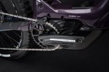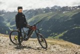 Eine Person fährt auf einem E-Mountainbike mit der Sonne im Rücken über eine Waldlichtung.