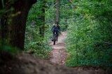 Eine Person fährt auf einem E-MTB durch einen lichten Wald.
