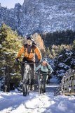 Drei Personen fahren auf Gravelbikes auf einem Schotterweg am Ufer eines Gewässers in den Bergen entlang.