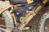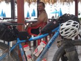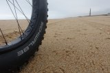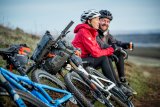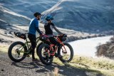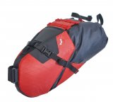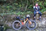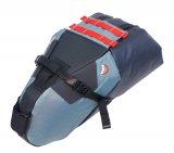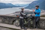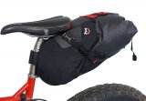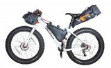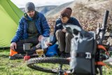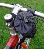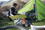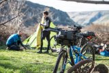 Eine Person tippt mit dem Finger auf das Display eines Smartphones oder Navigationsgeräts in einer Klarsichthülle auf dem Deckel einer Lenkertasche eines Fahrrades.