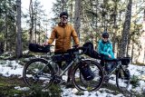 Zwei Personen stehen mit Fahrrädern mit Bikepacking-Taschen daran am Waldrand.