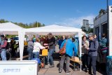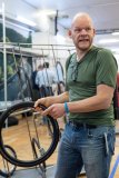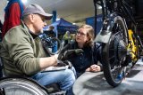 Zwei Personen betrachten ein Liegerad aus der Nähe.