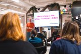 Eine Frau fährt auf einem blauen Lastenrad mit einem gelben Getränkekasten auf der Ladefläche über eine Brücke in der Stadt.